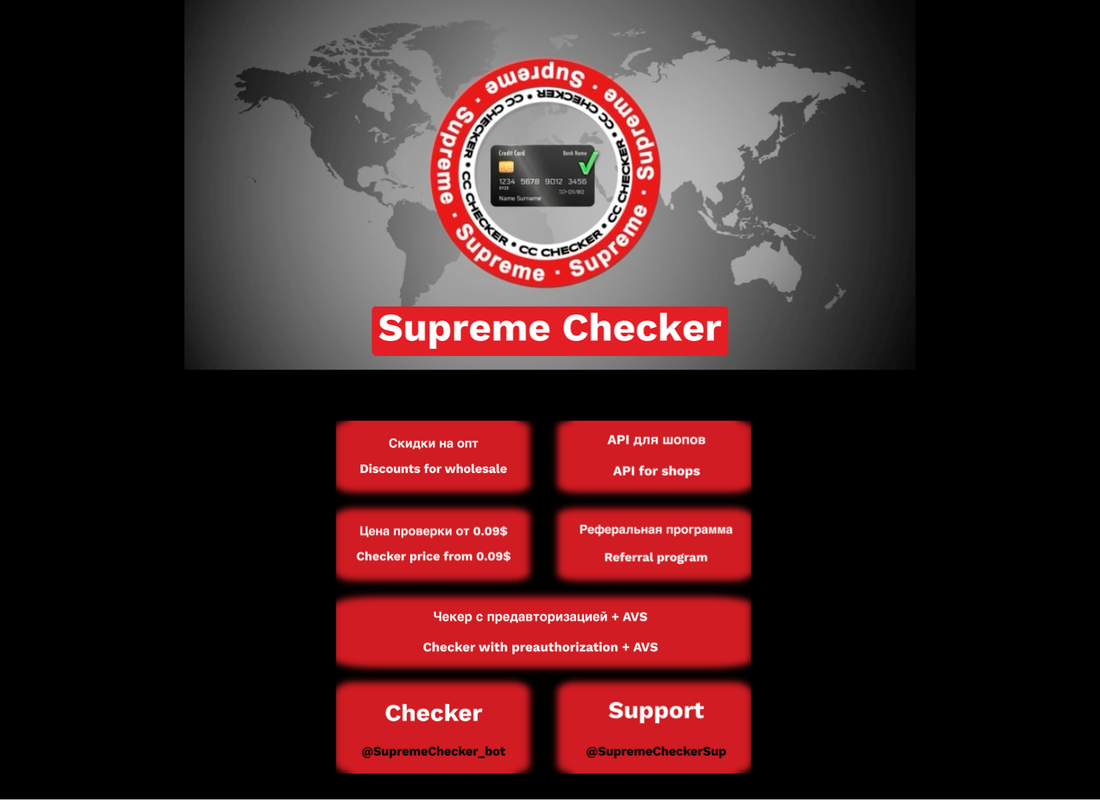 Предоставляем 20 тестовых чеков. В замен будем ждать от вас честный отзыв на форуме. Для получения бесплатных чеков нужно написать саппорту в телеграмм. (@SupremeCheckerSup) Supreme CC Checker 💳 @SCheckUpd - наш информационный канал t.me