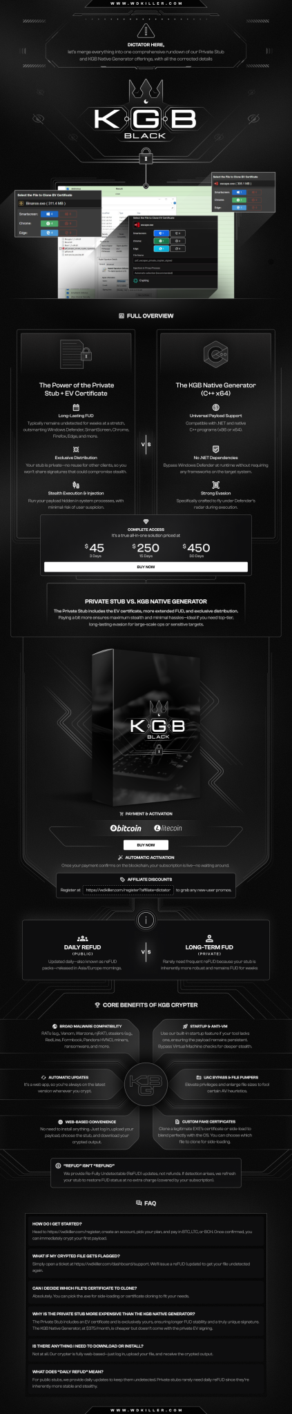 Now, for just $450 per month, enjoy unlimited crypts with our private crypter inside wdkiller.com. No more handmade crypting. Our service now bypasses Windows Defender, SmartScreen, Chrome, Edge, Firefox, and remains fully undetectable (FUD) for many days against Windows Defender.