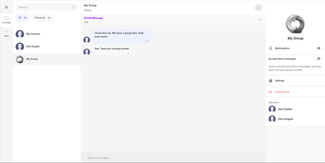 - Групповые чаты с настраиваемыми названиями, аватарами, описанием.
