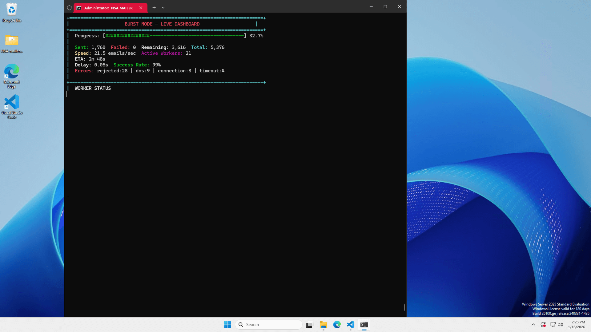 NSA-mailer is not only simple to use, it is also one of the most powerful and efficient mailers available. Designed with modern needs in mind, NSA-mailer is fully CLI-based, requires zero installation, and is not limited by the constraints of a traditional GUI. It is fast, flexible, and packed with all the essential features and functions needed to run a successful campaign, including:
