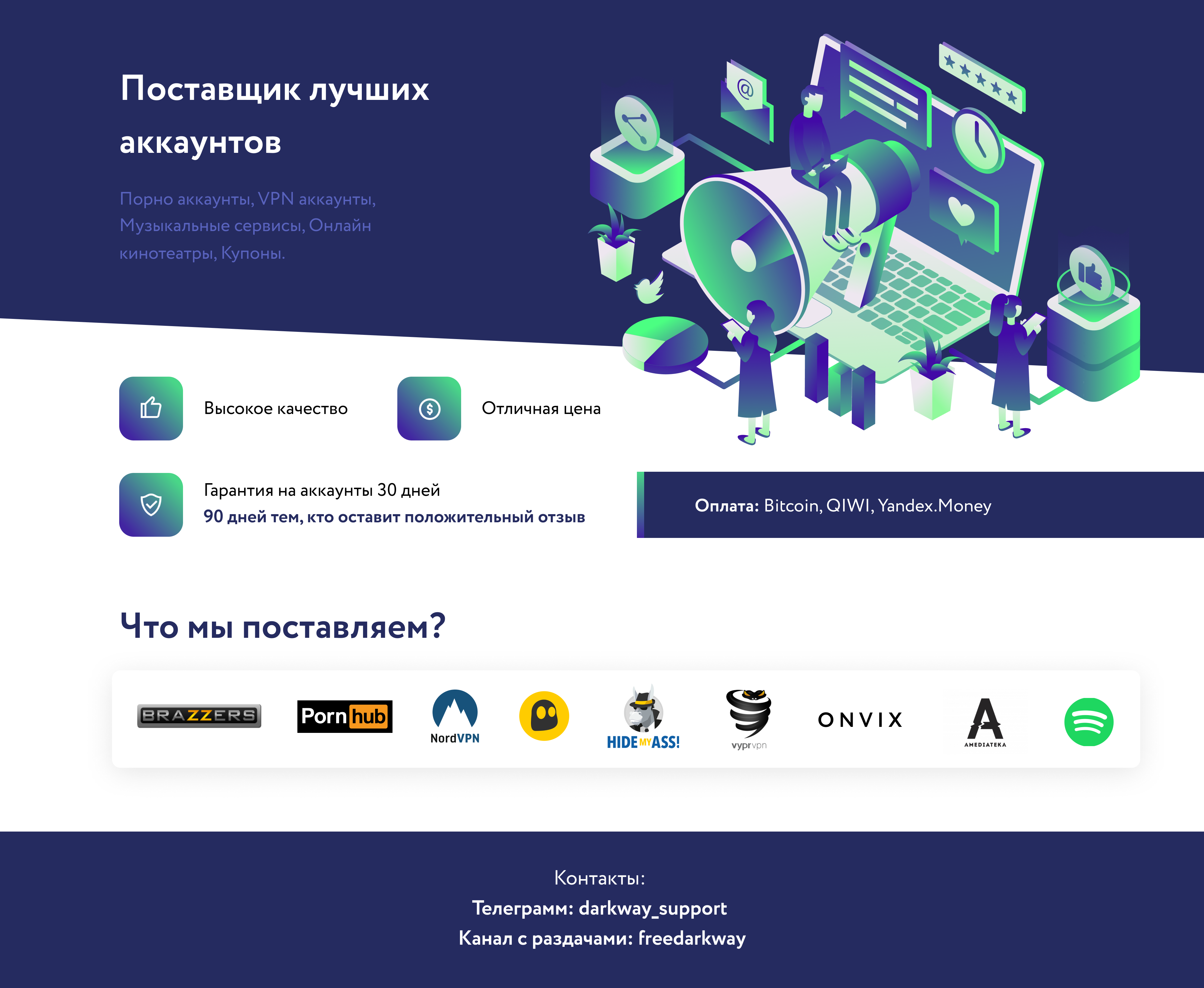 В нашем магазине одни из самых дешевых аккаунтов: VPN, Порно, Онлайн кинотеатров, и музыкальных сервисов!
