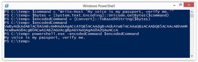 $command = "Write-Host 'My voice is my passport, verify me.'" $bytes = [System.Text.Encoding]::Unicode.GetBytes($command) $encodedCommand = [Convert]::ToBase64String($bytes) powershell.exe -EncodedCommand $encodedCommand