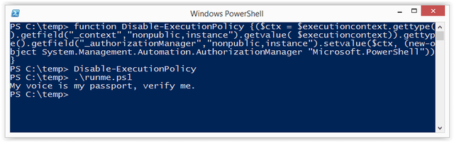 Как мы видели во введении, политика выполнения может применяться на многих уровнях. Это включает в себя процесс, который вы контролируете. Используя эту технику, политика выполнения может быть установлена неограниченно на время вашей Сессии. Кроме того, это не приводит к изменению конфигурации и не требует записи на диск. Первоначально я нашел эту технику в блоге r007break.