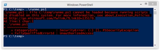 Когда я пытаюсь выполнить его в системе, настроенной с помощью Execution Policy по умолчанию, я получаю следующую ошибку: