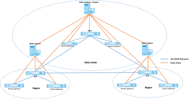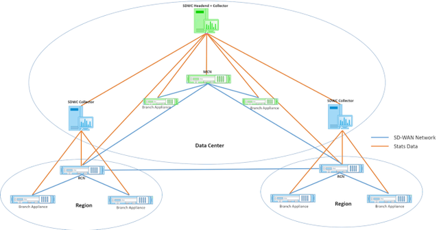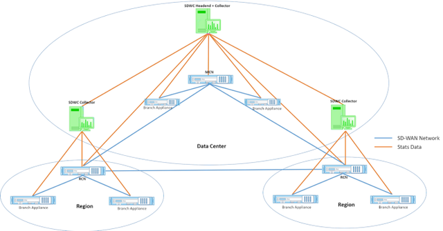 Запомните топологию сети, изображенную ниже, по ходу дела. Каждый узел представляет собой либо SDWC (например, головной узел, коллектор) или устройство SD-WAN (например, MCN, RCN, устройство филиала).
