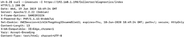 Как показано выше, в DiagnosticsController есть действие проверки связи. Этот метод действия содержит уязвимость внедрения команд ОС. Все три HTTP-параметра GET интерполируются без обработки в командную строку, которая выполняется функцией exec PHP. Благодаря CollectorController эта уязвимость может быть использована без аутентификации для получения root-доступа.
