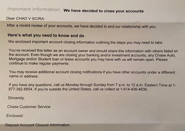 However they were still unable to tell me what the reason is, and this still seems very odd. But going back to what I dicussed with other represenatives over the phone Chase does claim that they can close your accounts for whatever reason they please, and are not required to explain how, or why.