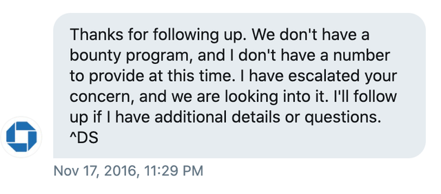 But because this was a bank I wanted to get their explicit permission before researching any further. I tried reaching out through many forms of communication but the one that finally got me into contact with a team that could assist was the @ChaseSupport twitter account, and after that I proceeded with proving that this was indeed an issue.