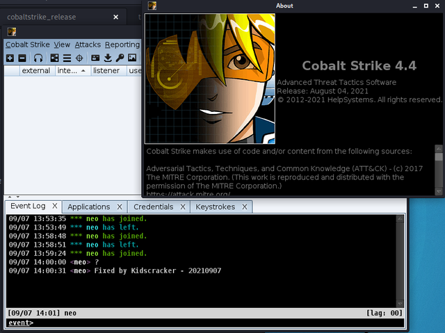 Я выпускаю исправленную версию Cobalstrike 4.4, скомпилированную из исходников. Он исправляет "ошибку консоли", выход из вкладок (учетные данные, нажатия клавиш и снимки экрана), а также отсутствующие файлы VPN.