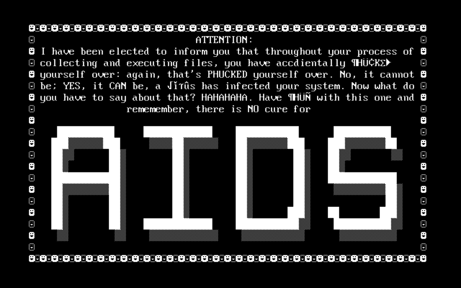 На волне этой паники биолог-эволюционист Джозеф Попп из Гарварда в декабре 1989 года разослал по всему миру участникам конференции Всемирной организации здравоохранения по СПИДу в Стокгольме 20 000 (!) дискет, подписанных как «AIDS Introductory Information Diskette Version 2.0» («Диск с вводной информацией по СПИДу, версия 2.0»). Да-да, «СПИД» был едва ли не единственным в истории компьютерным вирусом, который массово распространялся по «обычной», а не электронной почте.